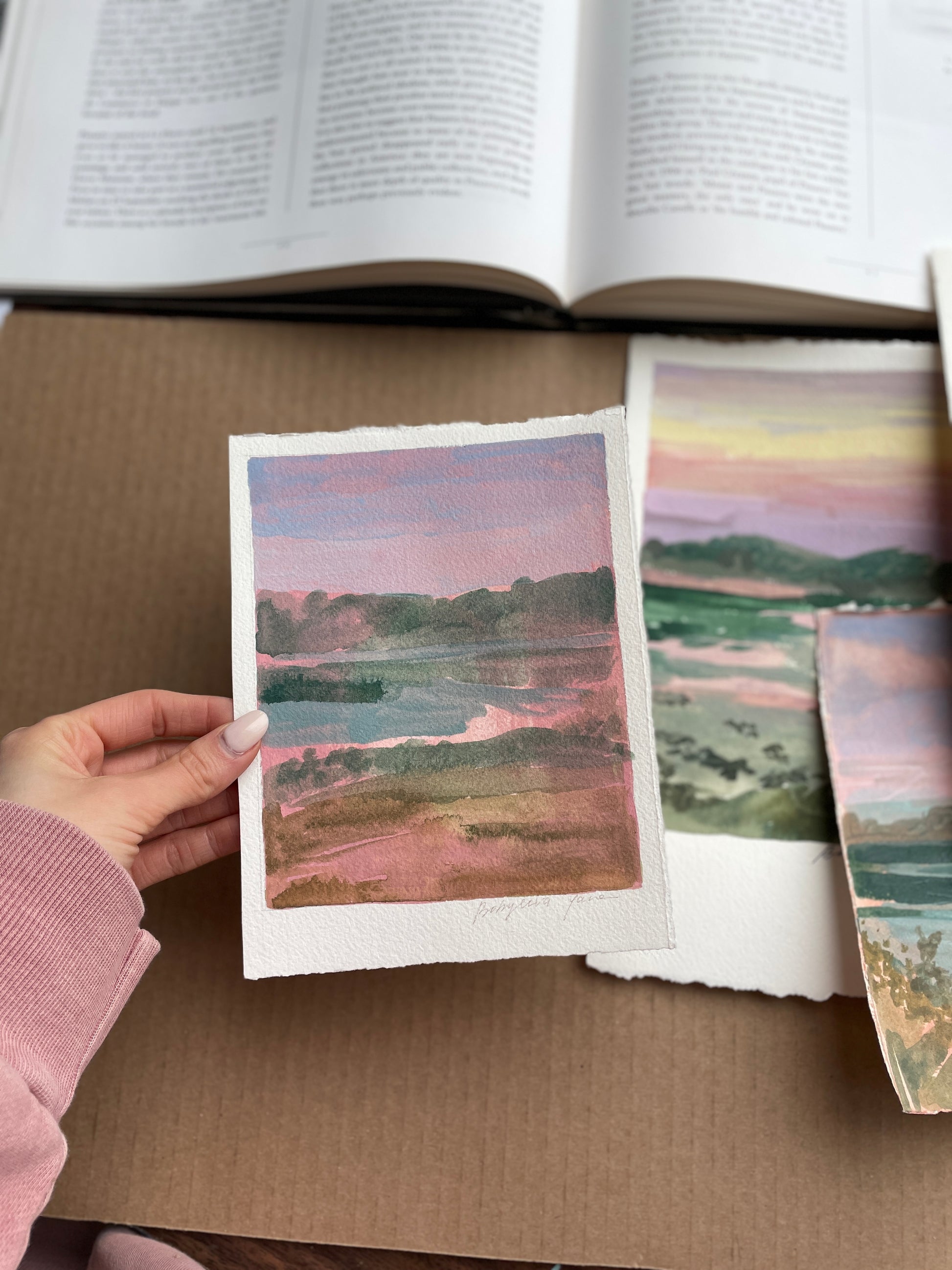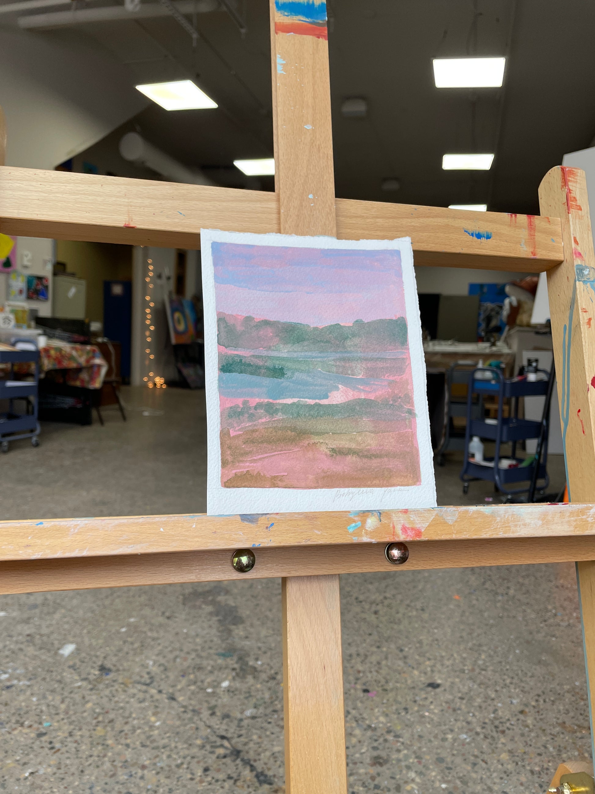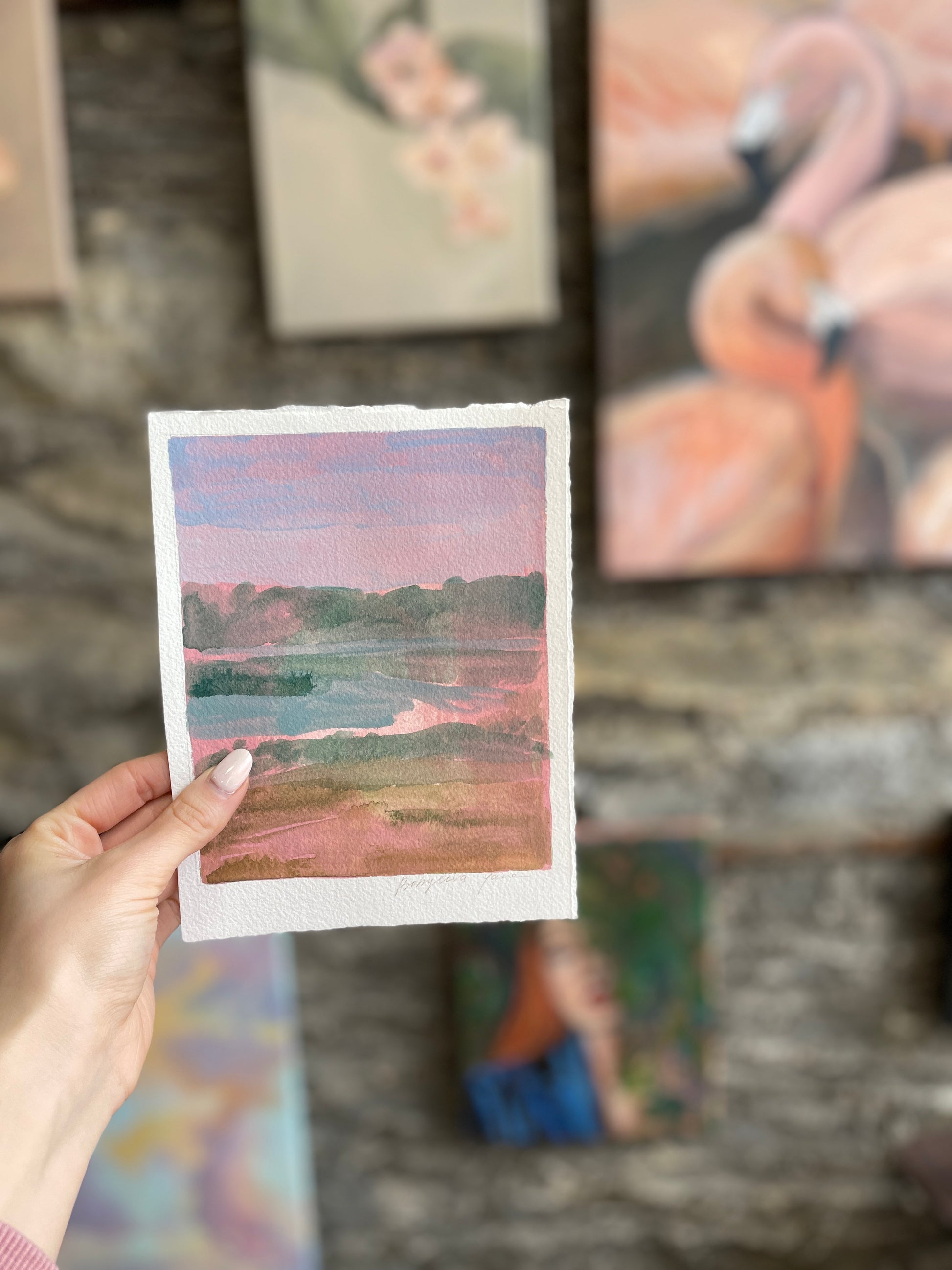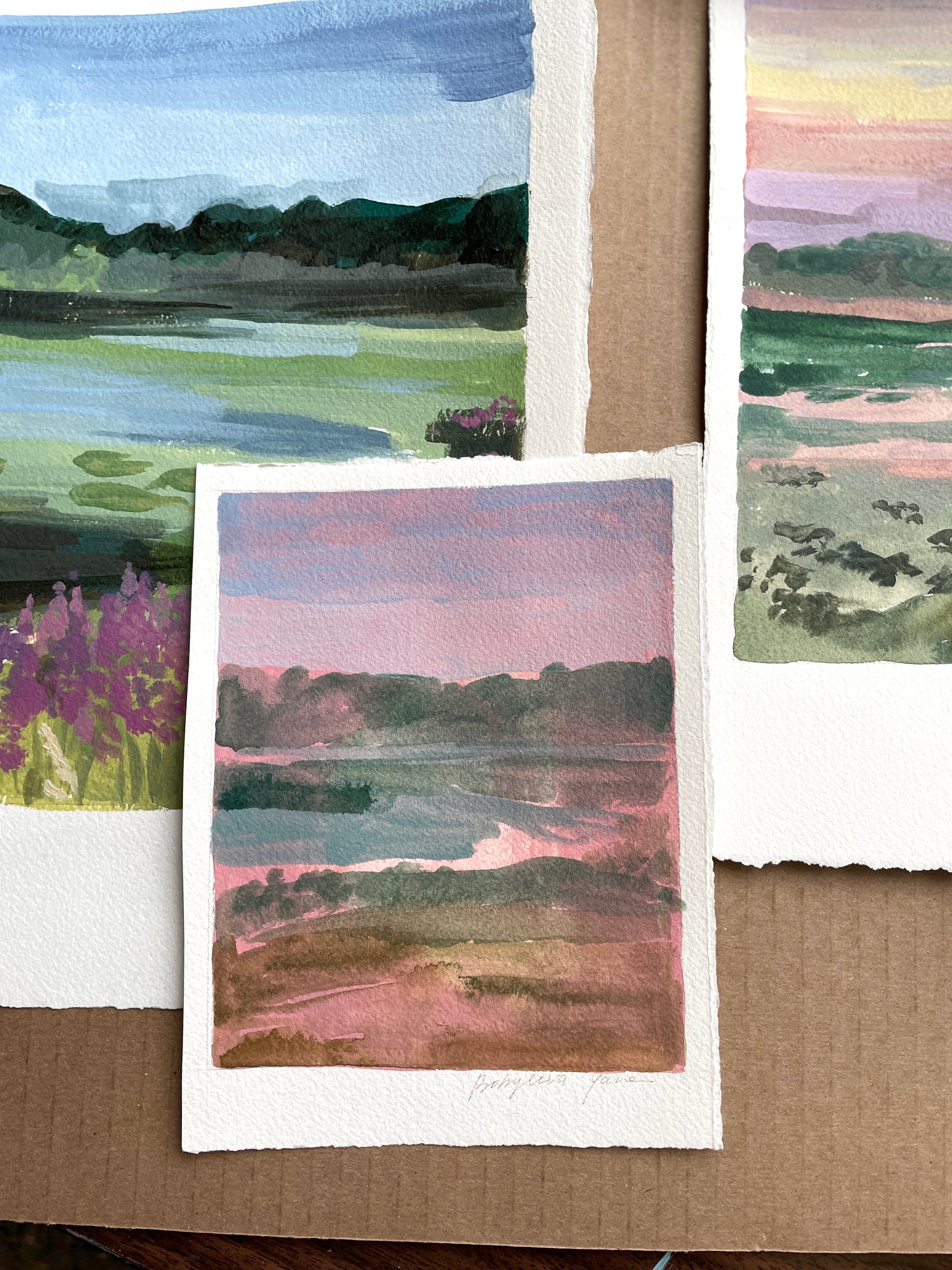 X SOLD Sunset Landscape. Acrylics on watercolor paper.